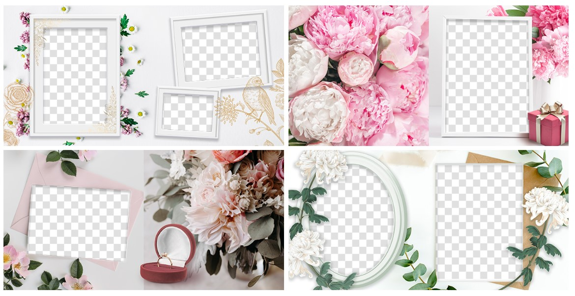 Свадебная тема включает в себя три варианта альбома: квадратный 250 х 250 мм, вертикальный 210 х 290 мм и горизонтальный 290 х 210 мм. Шаблоны для каждого разворота полностью адаптированы под выбранный формат.