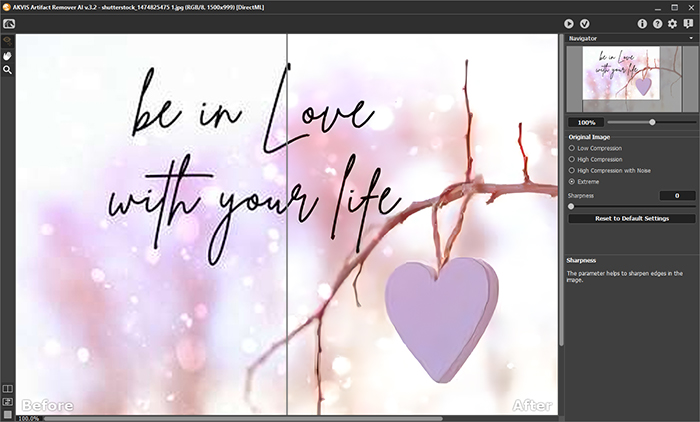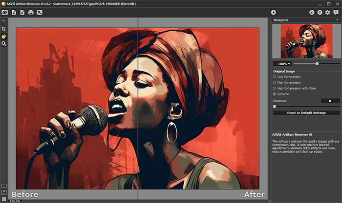 Программа Artifact Remover AI одинаково эффективна для избавления от всех типов артефактов, включая так называемый "москитный шум", пикселизацию и т. д. Это необходимый инструмент для начинающих пользователей и для профессионалов.