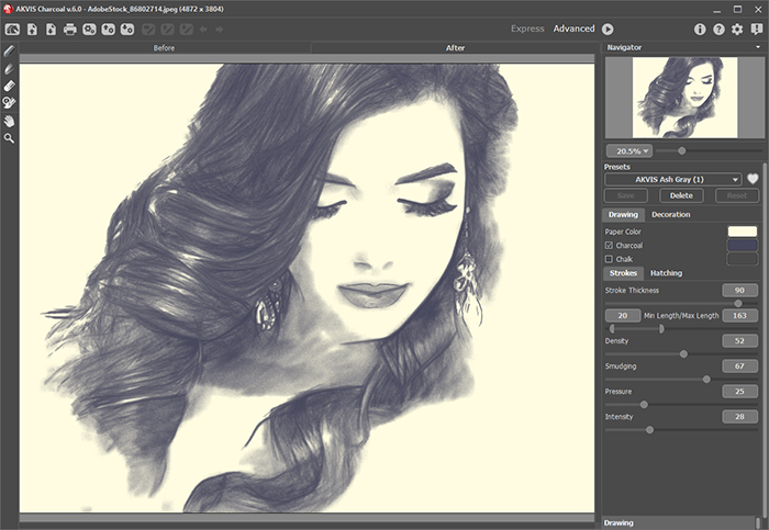Уголь и мел от АКВИС позволяет преобразовать фотографию в рисунок, выполненный углём и мелом. Уголь — один из самых популярных и древних материалов для рисования. Углём можно набросать эскиз или выполнить самостоятельное произведение. Данный инструмент обладает большими изобразительными возможностями, соединяя в себе преимущества различных материалов.