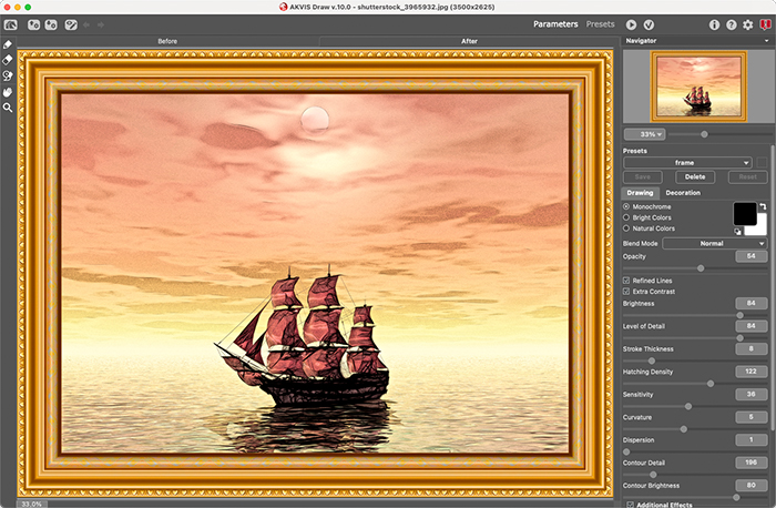 Программа проста в использовании: изображение при загрузке сразу превращается в рисунок с учетом заданных настроек. Преобразование происходит автоматически, результат можно отредактировать с помощью ластика, который помогает убрать лишние штрихи или смягчить слишком резкие линии.