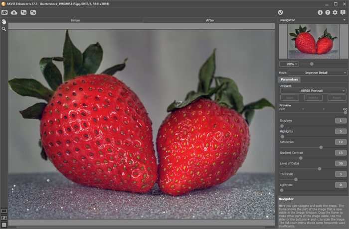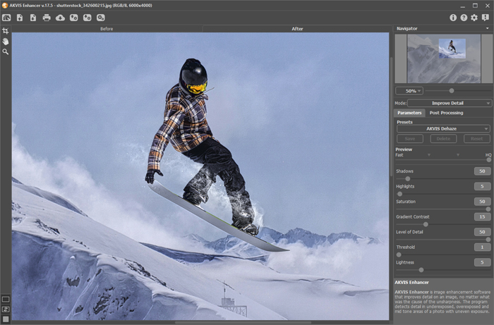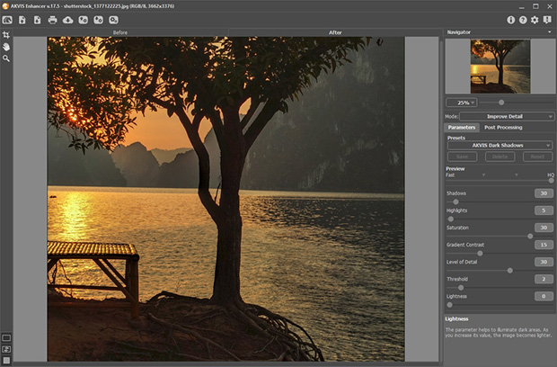 Фотокоррекция от АКВИС (AKVIS Enhancer) — программа для обработки фотографий, предназначенная для улучшения детализации снимка, коррекции затемненных областей и повышения резкости границ. Программа работает в трех режимах: Улучшение деталей, Допечатная обработка и Тоновая коррекция. Задача режимов одна — коррекция, но способы исправления изображения, а, соответственно, и результаты — разные. Для разных изображений и разных целей подойдут разные режимы обработки, а в некоторых случаях можно использовать поочередно все.