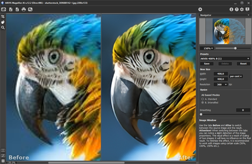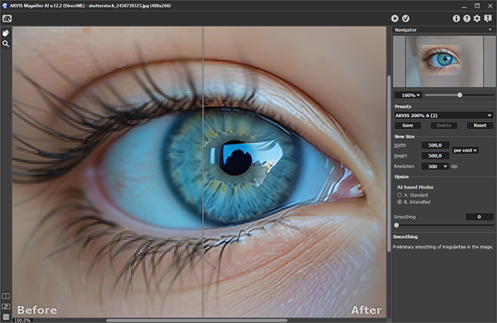 Благодаря улучшенным алгоритмам на основе нейронных сетей программа качественно увеличивает изображения, создавая потрясающие картины огромных размеров. Программа обеспечивает увеличение фотографии до 800% без артефактов и ореолов.