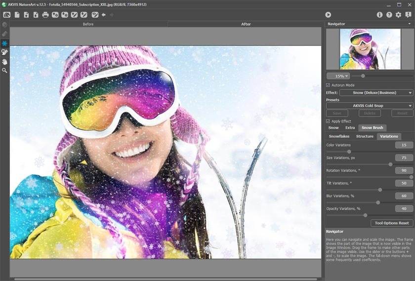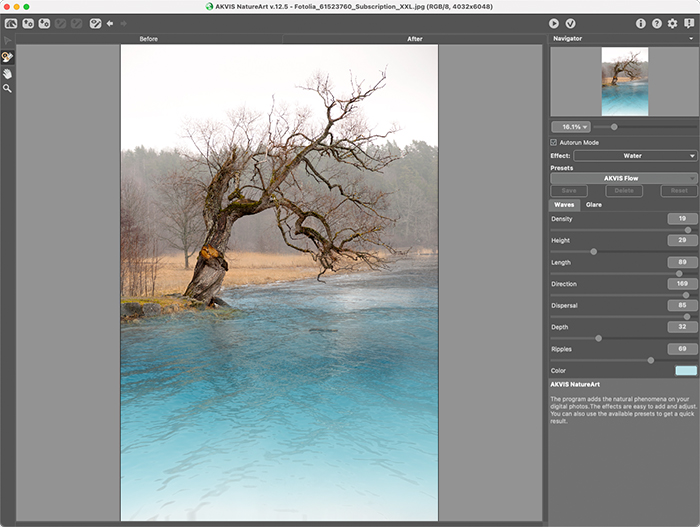 Природные эффекты от АКВИС (AKVIS NatureArt) — коллекция уникальных эффектов, имитирующих природные явления. В программе доступно 12 эффектов: Дождь, Солнце, Вода, Молния, Облака, Изморозь, Радуга, Полярное сияние, Огонь, Лёд, Звёздное небо и Снег. Основные эффекты позволяют создать множество разнообразных вариантов использования природных явлений.