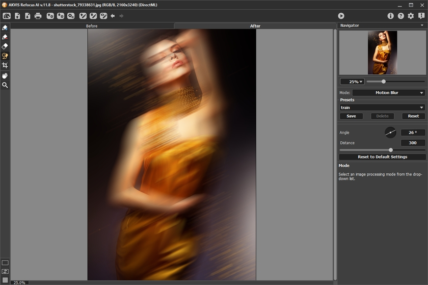 - Режим Размытие движения позволяет имитировать движение предметов на статичных изображениях. Он создает эффект быстродвижущегося объекта, размывая изображение в линейном направлении. Вы можете применить эффект к целому изображению или сместить акцент на определенные области путем размытия фона. Добавьте своим изображениям больше динамики!