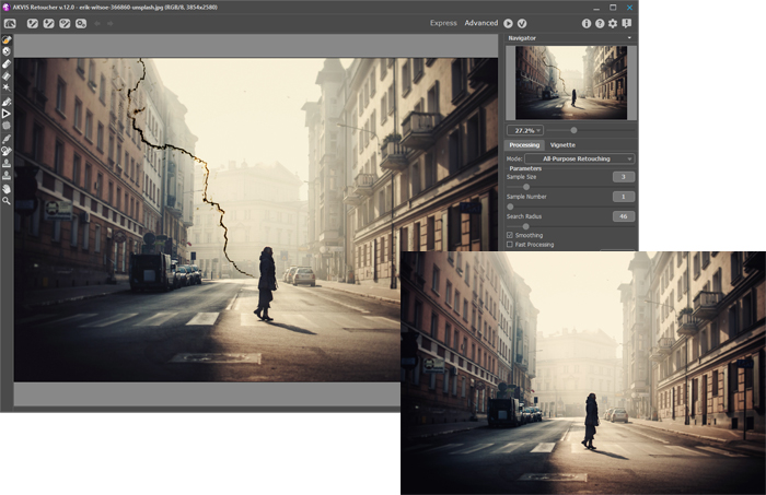 Ретушер не просто удаляет царапины, пятна, пыль и прочие дефекты с поверхности фото, он воссоздает недостающие фрагменты, используя соседние участки изображения.