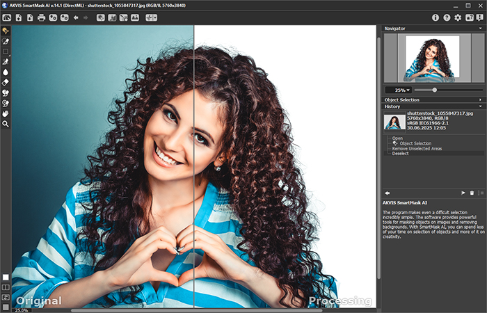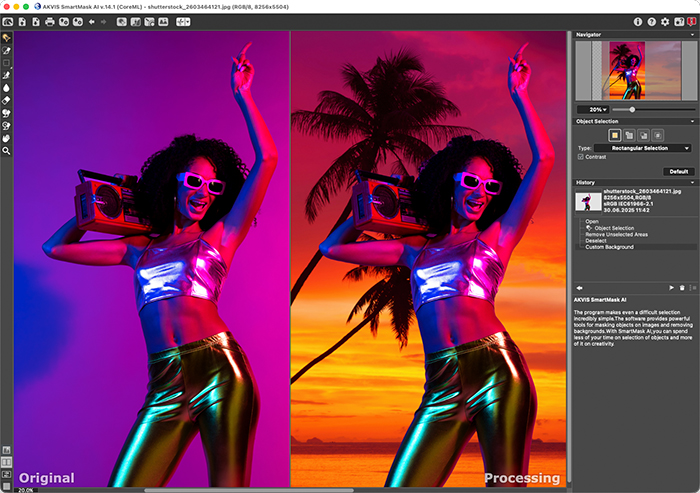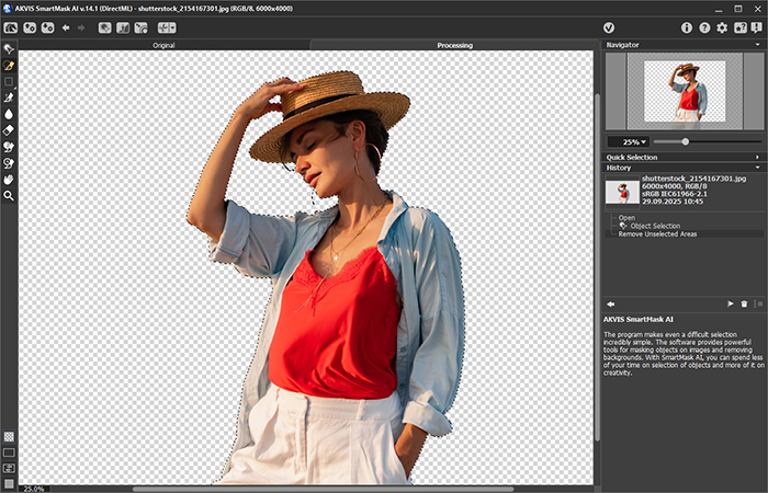 AKVIS SmartMask AI — эффективная программа для выделения объекта на изображении. Оснащенная инструментами искусственного интеллекта, эта программа представляет собой быстрый и удобный способ выделять объекты и удалять фон.