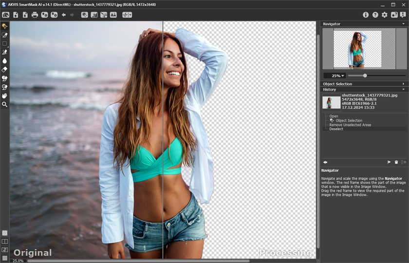 AKVIS SmartMask AI позволяет быстро и качественно вырезать часть фотографии, например, отделить фигуру человека от фона. Программа делает даже сложное выделение невероятно простым! Теперь вы можете тратить меньше времени на выделение объектов и больше на творчество.