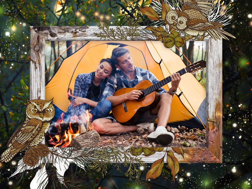 Лесные рамки добавят снимкам авантюризма или, напротив, создадут атмосферу релакса. Готовые шаблоны украшены изображениями лесных птиц, животных, растений, а также туристического снаряжения: палаток, надувных лодок, удочек.