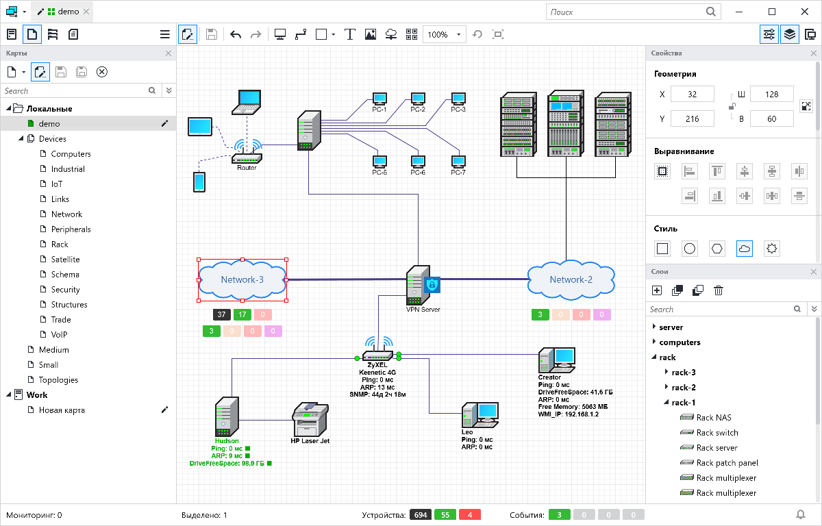 - Визуализация компьютерной сети: редактор схемы сети, коллекция устройств, инструменты навигации, векторная графика, учет портов и интерфейсов, экспорт/импорт Visio. В том числе автоматическое построение схемы связей.