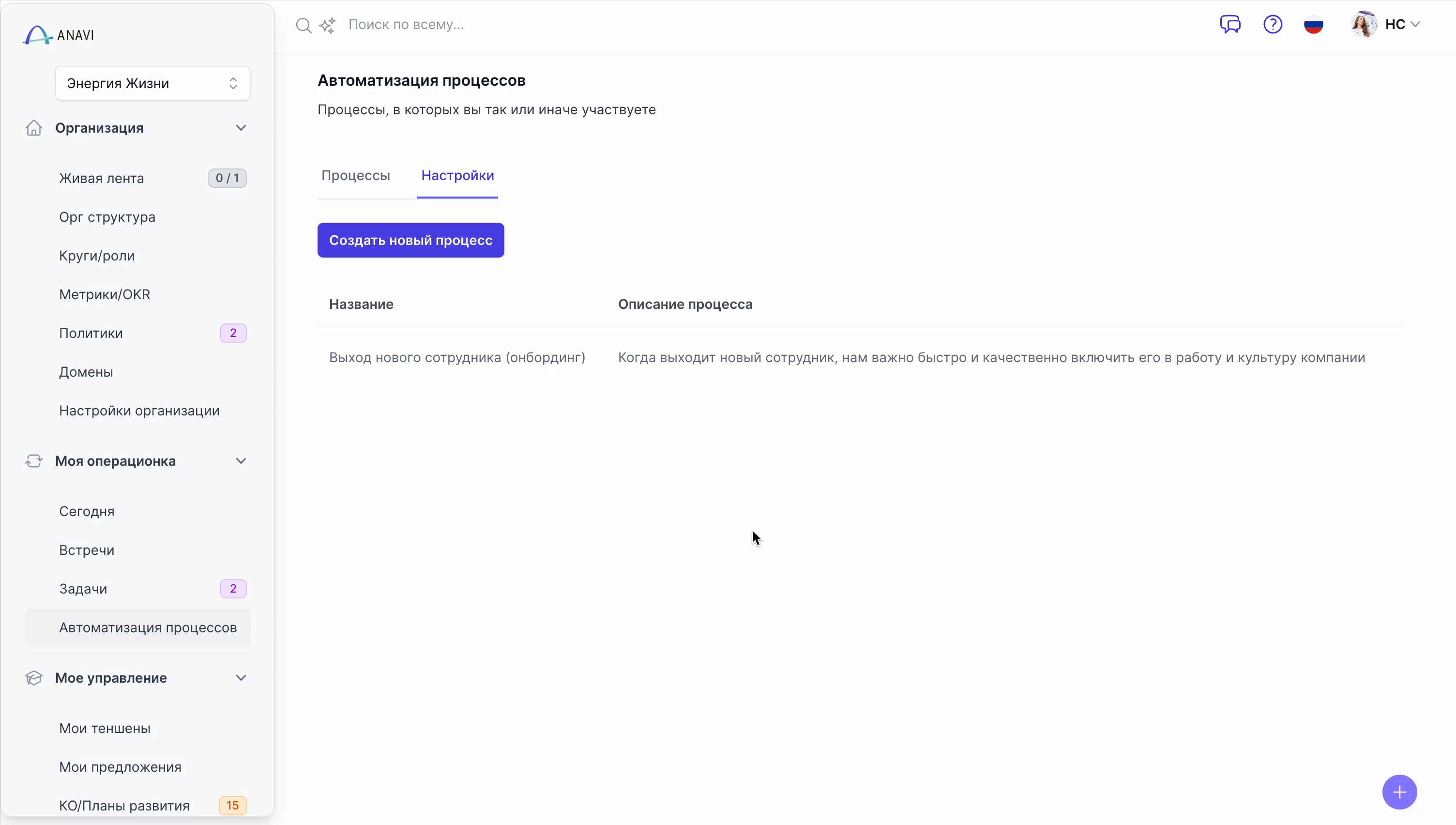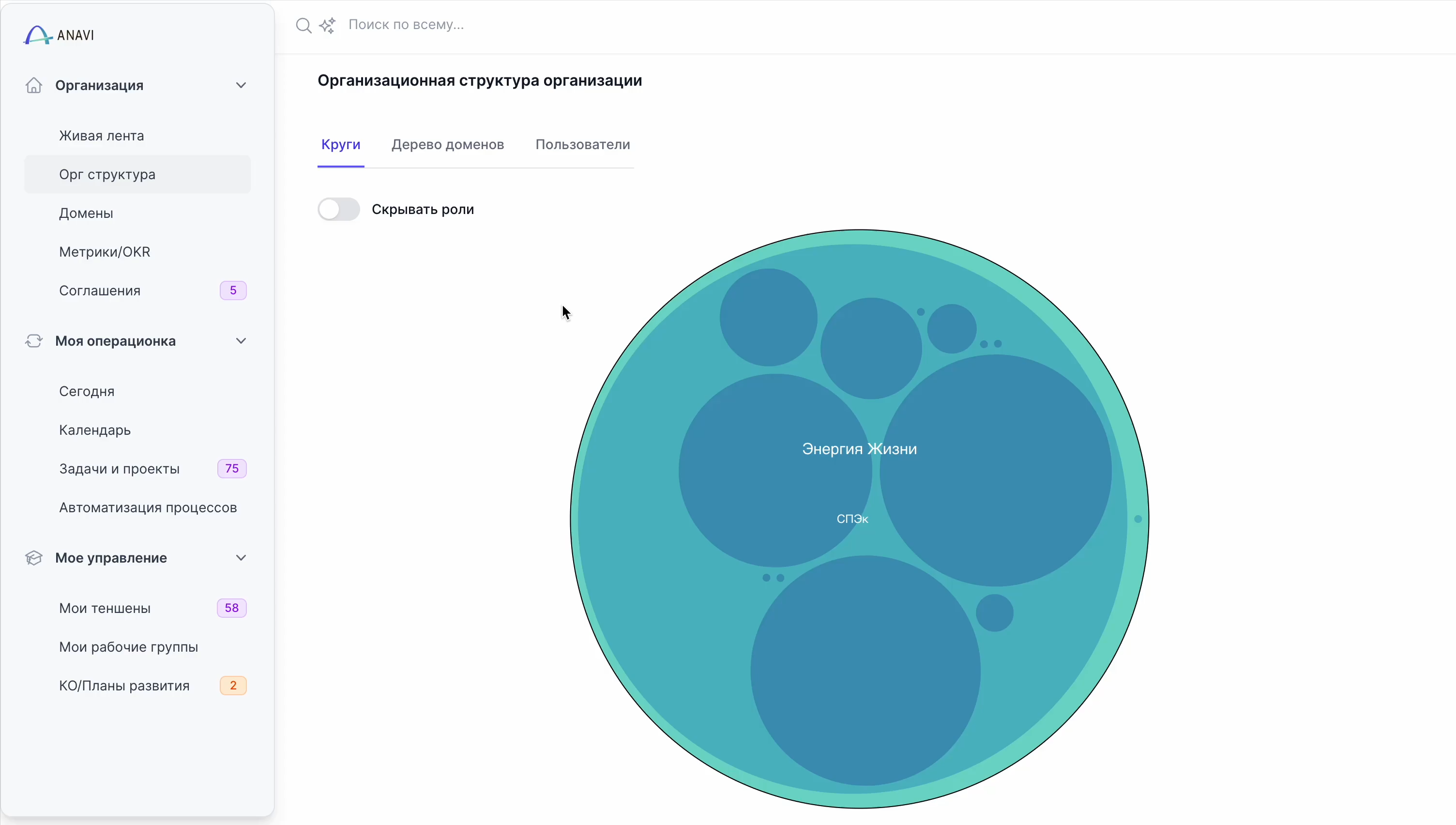 Решение: ANAVI визуализирует оргструктуру, роли и зоны ответственности. Метрики и задачи связаны с конкретными ролями — видно, где узкое место, а где всё работает.