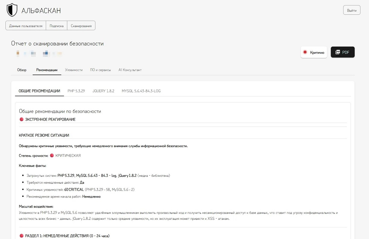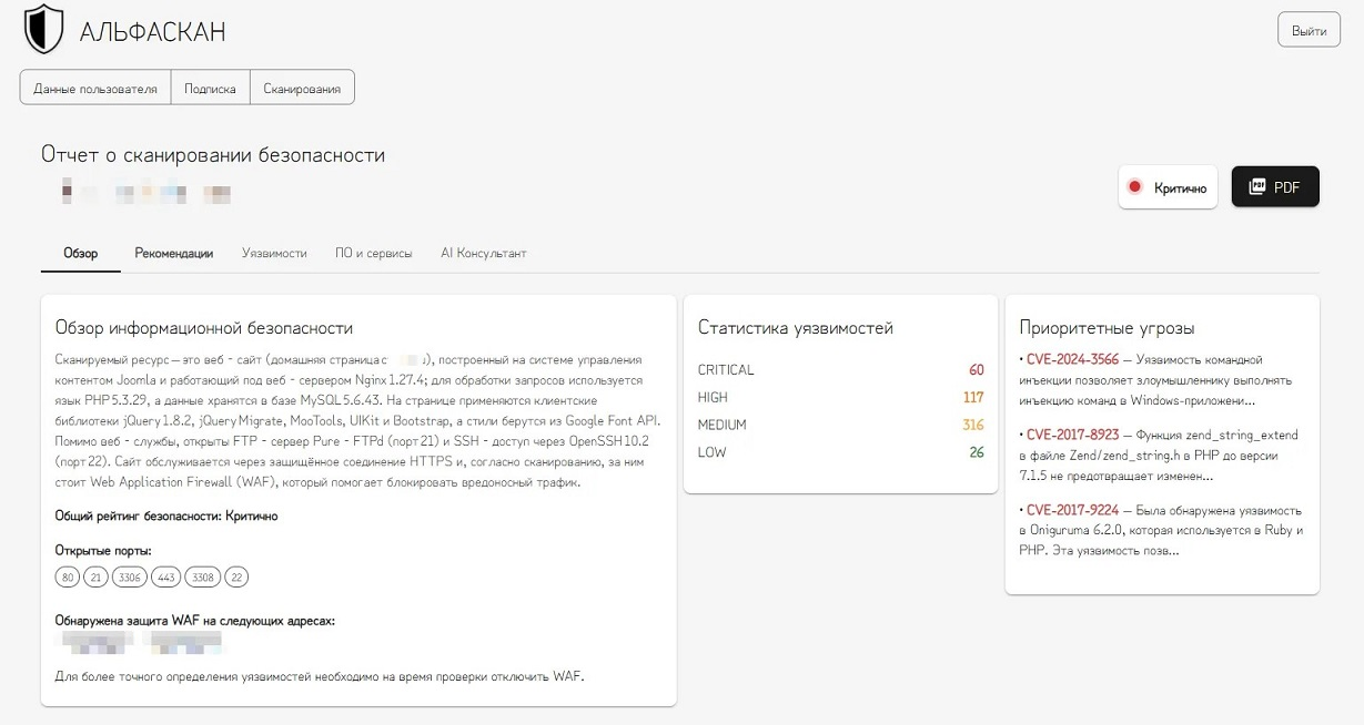 АльфаСкан — это передовой продукт для защиты вашего сайта и интернет-ресурсов от киберугроз. АльфаСкан быстро и эффективно сканирует ваши ресурсы на наличие уязвимостей, выявляет их и предлагает простые шаги по устранению. Альфаскан разработан, чтобы избежать денежных убытков и тяжелых последний для бизнеса, которые всегда возникают после взломов сайтов.