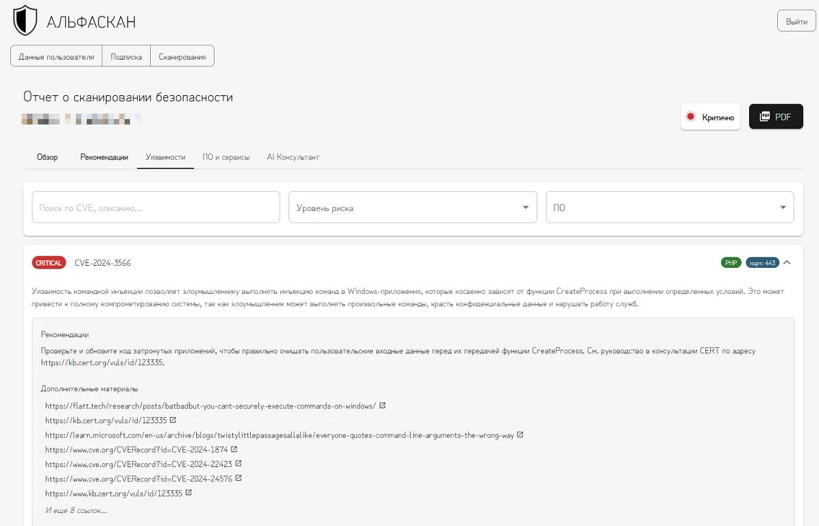 - Интеграция с каталогом уязвимостей NVD/CVE и БДУ ФСТЭК России