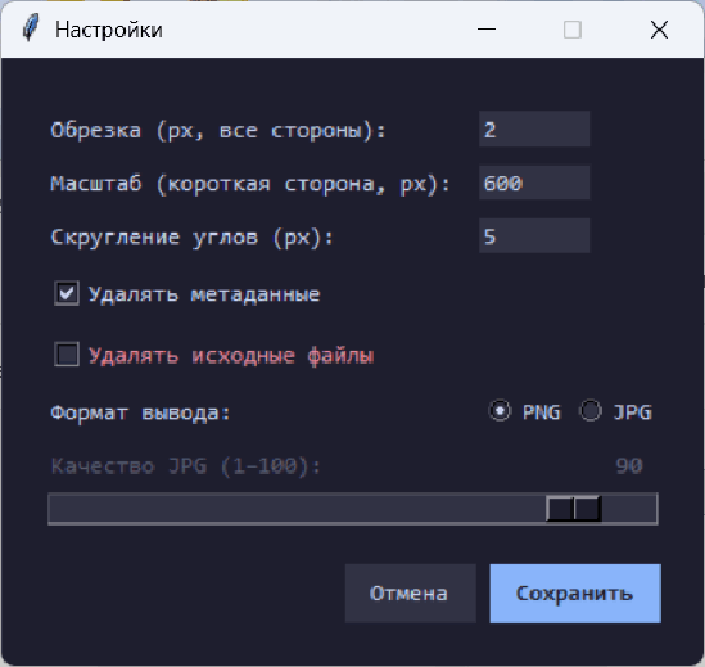 - Выбор формата — сохраняет результат в PNG или JPG с настраиваемым качеством сжатия.