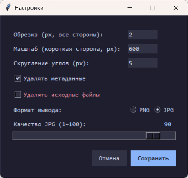 - Удаление исходных файлов — опционально удаляет оригиналы после успешной обработки.