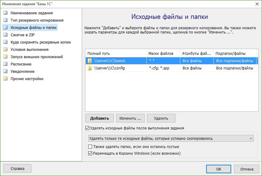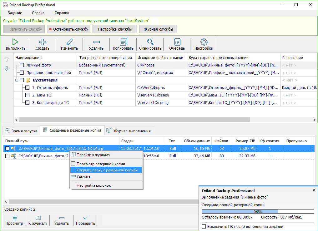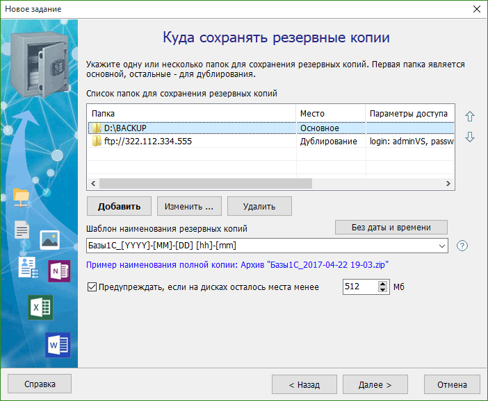 - Автоматическое дублирование резервных копий для повышения надежности: в локальную или сетевую папку, на внешний винчестер, а также по FTP/SFTP.