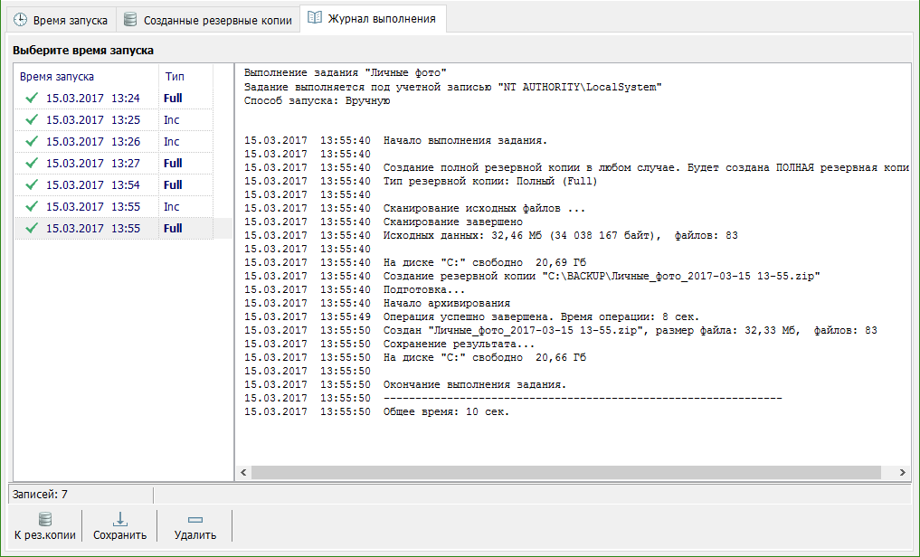 - Автоматическое удаление старых резервных копий. Если установлено ограничение по количеству резервных копий, то при превышении заданного ограничения самая старая резервная копия удаляется автоматически. Это существенно экономит место на диске и избавляет Пользователя от заботы о дисковом пространстве.