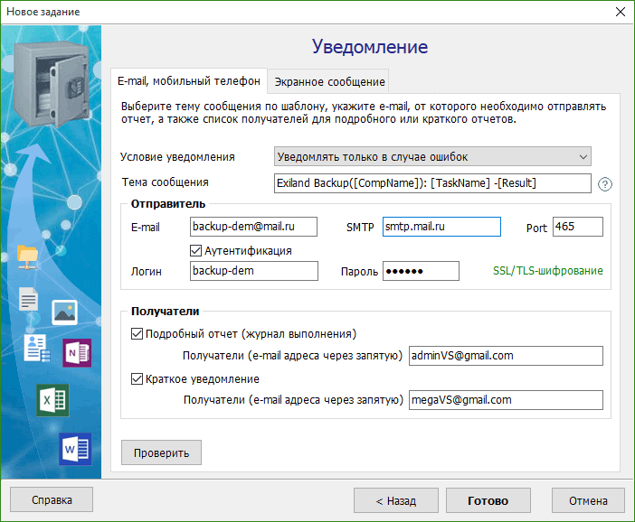 - Уведомление о результатах резервного копирования на E-mail, на экран или в журнал событий Windows в случае ошибок/предупреждений, либо в любом случае. Предусмотрен полный и краткий вид отчета.
