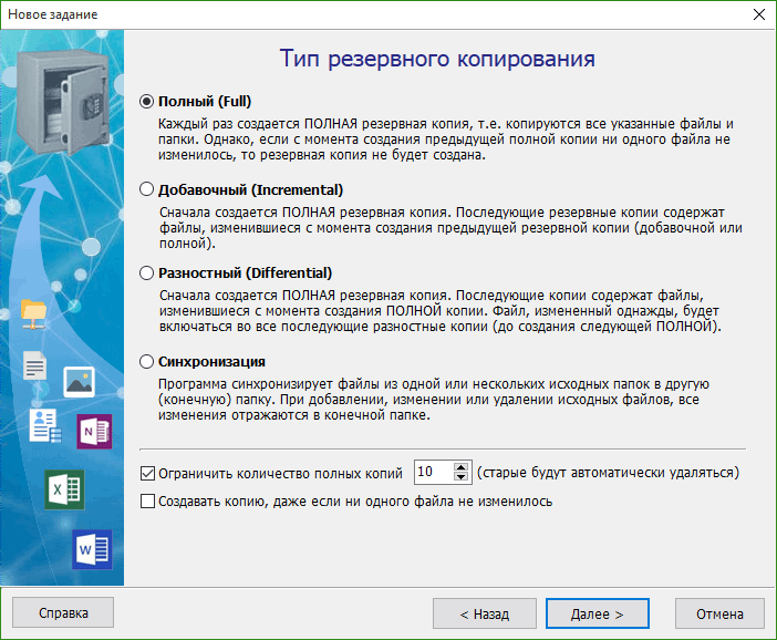- Поддержка 4 типов резервного копирования: полное (Full), Добавочное (Incremental), Разностное (Differential) и Синхронизация папок. Возможность копирования только новых и изменившихся файлов с момента создания предыдущей резервной копии.