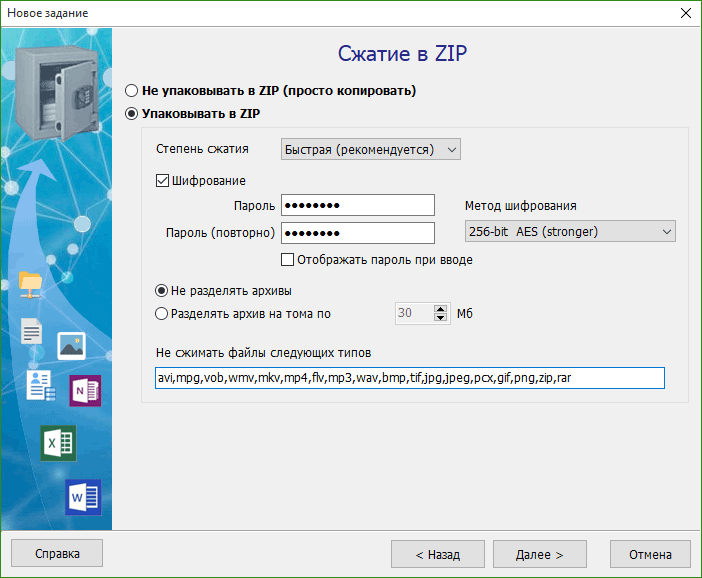 - Сжатие данных в формате ZIP, 7-Zip, либо простое резервное копирование (без архивирования); установка пароля на ZIP-архивы, шифрование, выбор степени сжатия, разделение архивов на тома, поддержка больших архивов в формате ZIP64 и т.п..