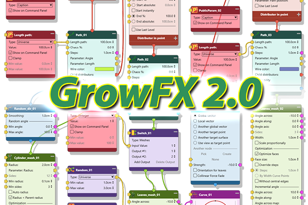 GrowFX - это плагин для Autodesk 3dsMax, который позволяет генерировать любое 3d растение, а также создавать анимацию роста и ветра. Новая версия 2.0 имеет нодовый редактор, что дает пользователю полный контроль над всеми компонентами системы. В отличии от предыдущих версий, версия 2.0 уже имеет некоторые новые типы нод, такие как Public Parameter, Math, Random Generator, Switch и др.