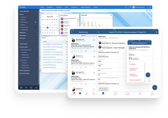 Мобильная версия системы позволяет управлять бизнес-процессами компании, контролировать выполнения поручений, а также осуществлять доступ к необходимой информации и документации с мобильного устройства (работа со всеми популярными операционными системами, поддержка различных браузеров, мультиязычный интерфейс).