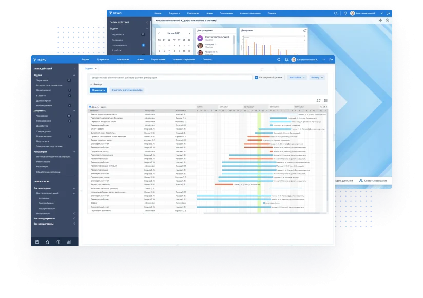 Система ТЕЗИС поставляется в двух редакциях — Стандартная и Расширенная, что обеспечивает Заказчику возможность подбора оптимального варианта решения бизнес-задач. При этом во всех редакциях возможна работа с задачами, документами и канцелярией.