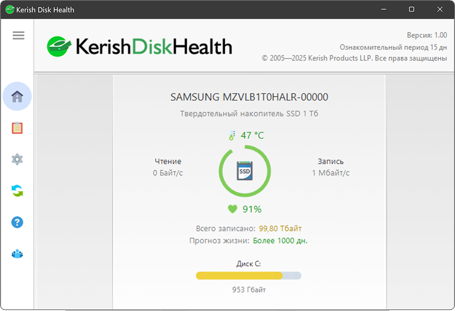 от 19,30 руб. Выбрать лицензиюПрограмма предназначена для постоянного мониторинга физических накопителей (SSD и HDD) — она оценивает состояние диска, прогнозирует оставшийся срок его службы, отслеживает температуру и выводит предупреждения о возможных проблемах.