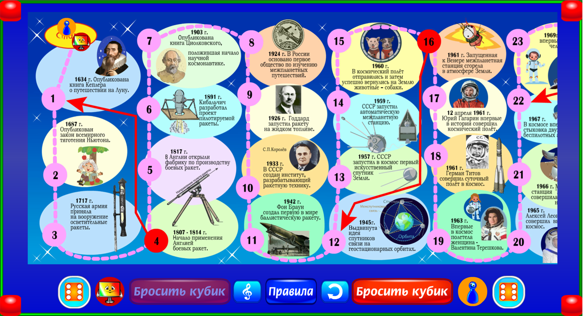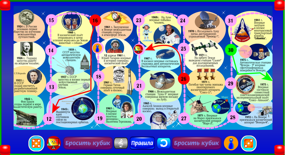 Бросая кубик и перемещаясь на число шагов, соответствующее количеству выпавших очков, игрок знакомится с событиями, которые привели к появлению первых ракет, их модернизации и превращению в средство освоения космоса..