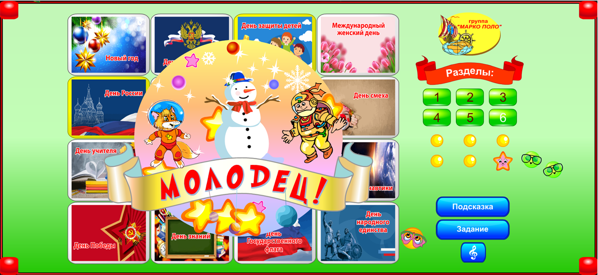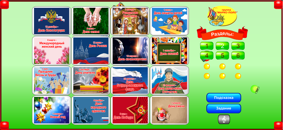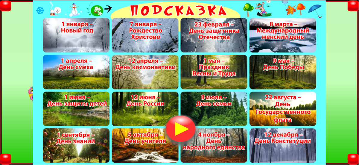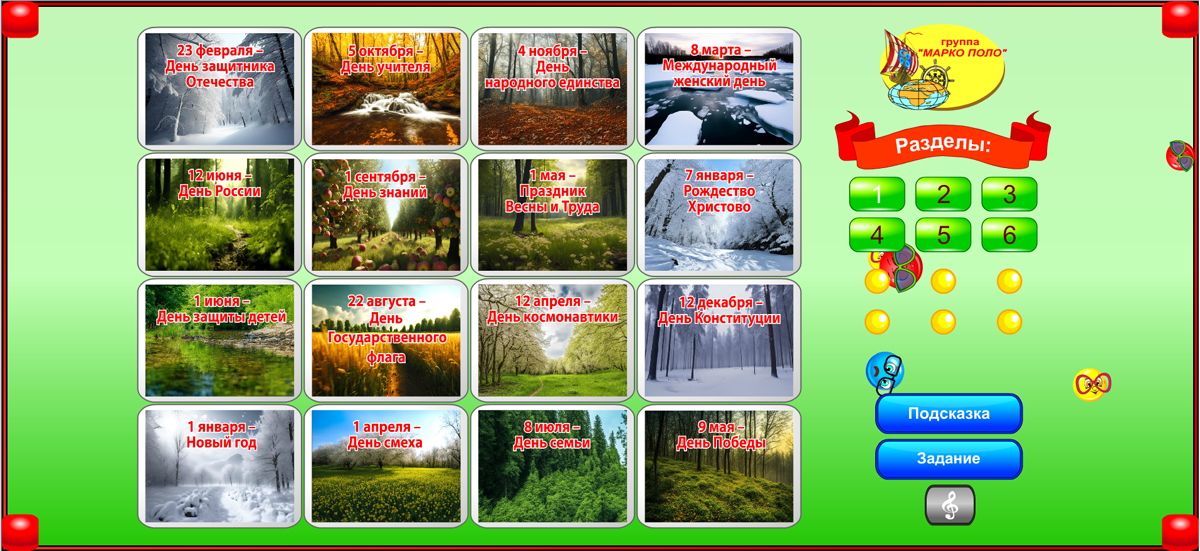 В шести разделах программы ребёнок тренируется в определении последовательности и времени наступления праздников, их распределению по месяцам и временам года.