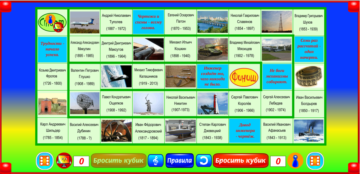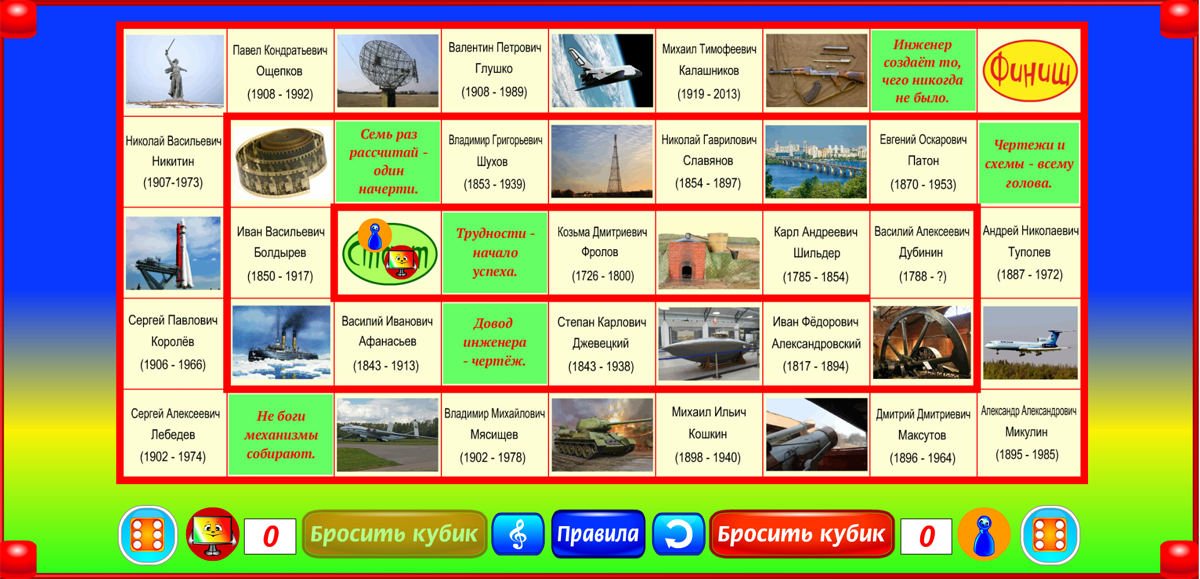 Бросая кубик и перемещаясь на число шагов, соответствующее числу выпавших очков, игрок знакомится с самыми известными инженерами и конструкторами России. Когда фишка попадает на имя инженера, открывается его портрет и звучит короткий рассказ о нём. При этом игрок получает дополнительно пять очков к результату, выпавшему на кубике. Если первой финиширует фишка с большим, чем у соперника числом очков, она объявляется победителем. Если первой приходит фишка с меньшим числом очков, чем набрал отставший соперник, объявляется ничья.