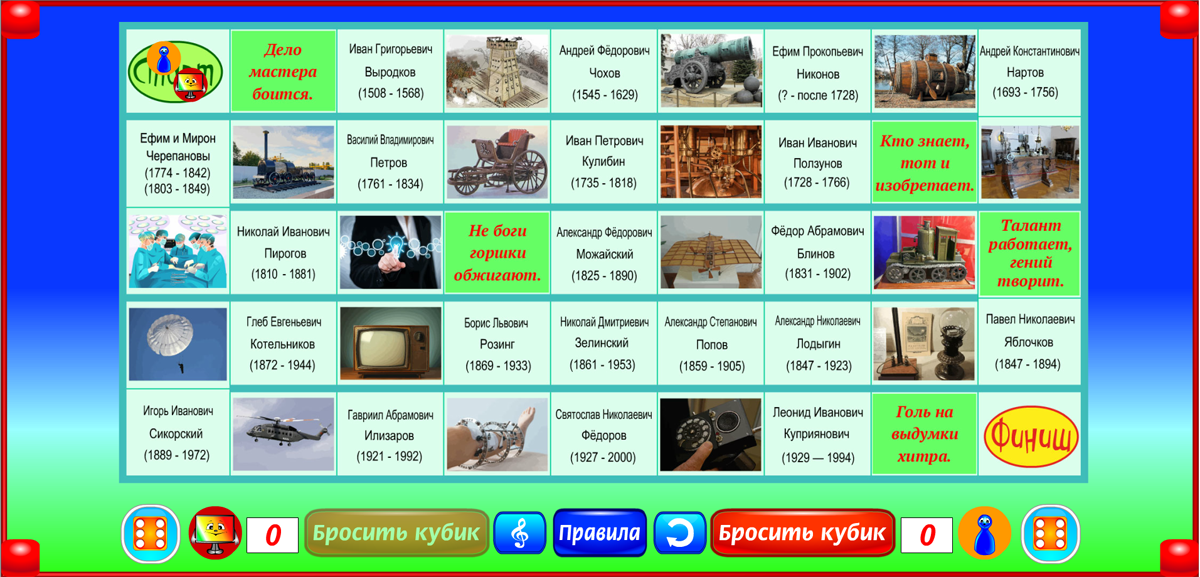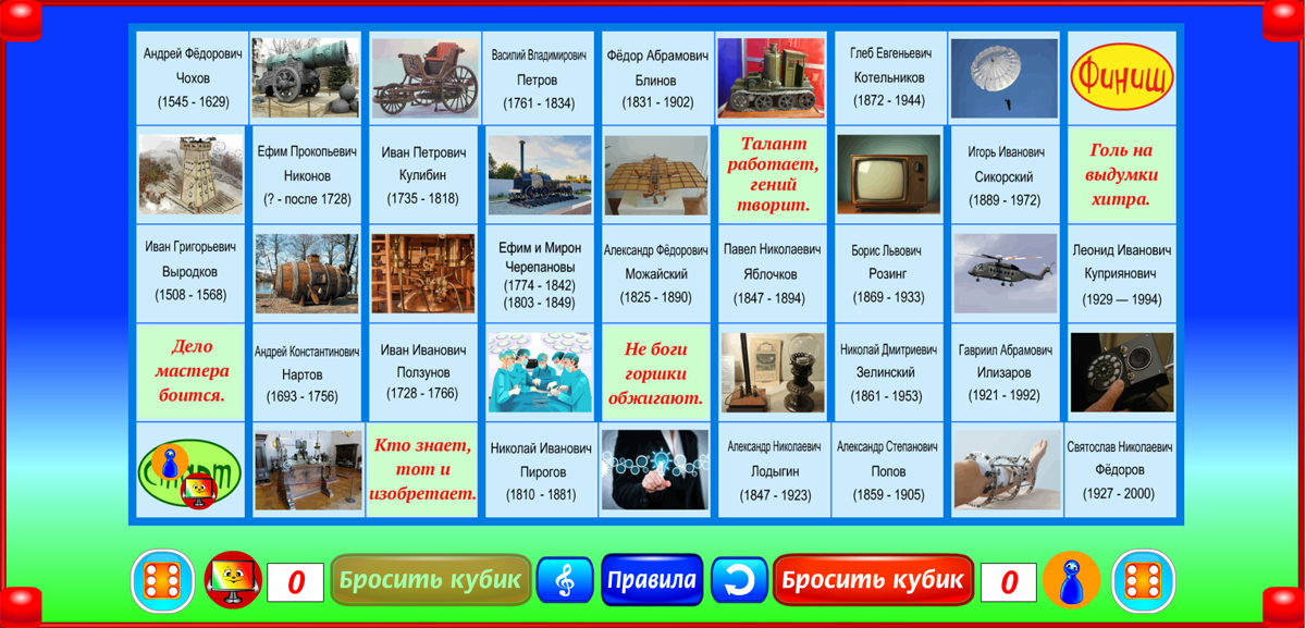Бросая кубик и перемещаясь на число шагов, соответствующее числу выпавших очков, игрок знакомится с изобретателями России. Когда фишка попадает на имя изобретателя, открывается его портрет и звучит короткий рассказ о нём. При этом игрок получает дополнительно пять очков к результату, выпавшему на кубике.