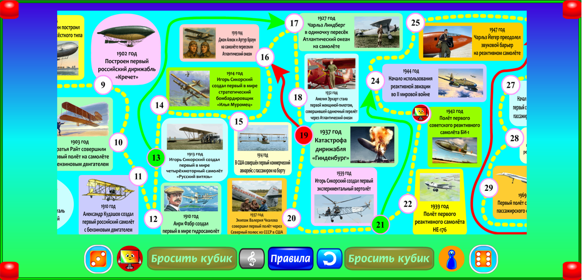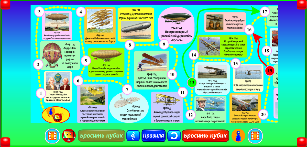 Бросая кубик и перемещаясь на число шагов, соответствующее количеству выпавших очков, игрок знакомится с историей появления воздушных шаров, их превращения в дирижабли, создания первых леталельных аппаратов тяжелее воздуха и их развития в современные самолёты.