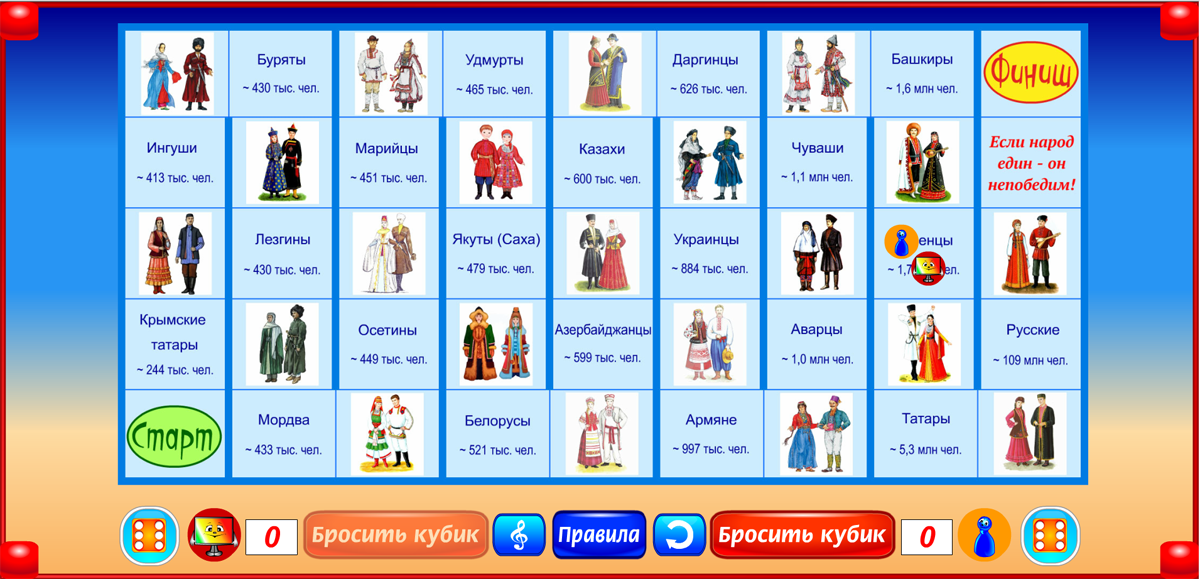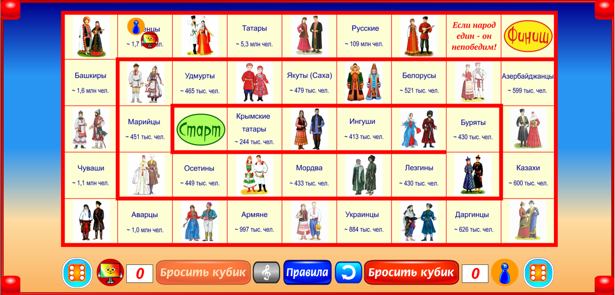 Серия игр «Лица России», в которую входит игра «Народы России», составлена в рамках программы «Сказочное образование». Программа «Народы России» представляет собой игру для знакомства детей 6-10 лет с народами нашей страны. Бросая кубик и перемещаясь на число шагов, соответствующее числу выпавших очков, игрок знакомится с народами России. Когда фишка попадает на название народа, открывается изображение его представителей в национальных одеждах и звучит короткий рассказ о нём. При этом игрок получает дополнительно пять очков к результату, выпавшему на кубике. Если первой финиширует фишка с большим, чем у соперника числом очков, она объявляется победителем. Если первой приходит фишка с меньшим числом очков, чем набрал отставший соперник, объявляется ничья.