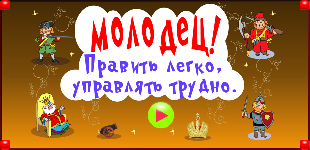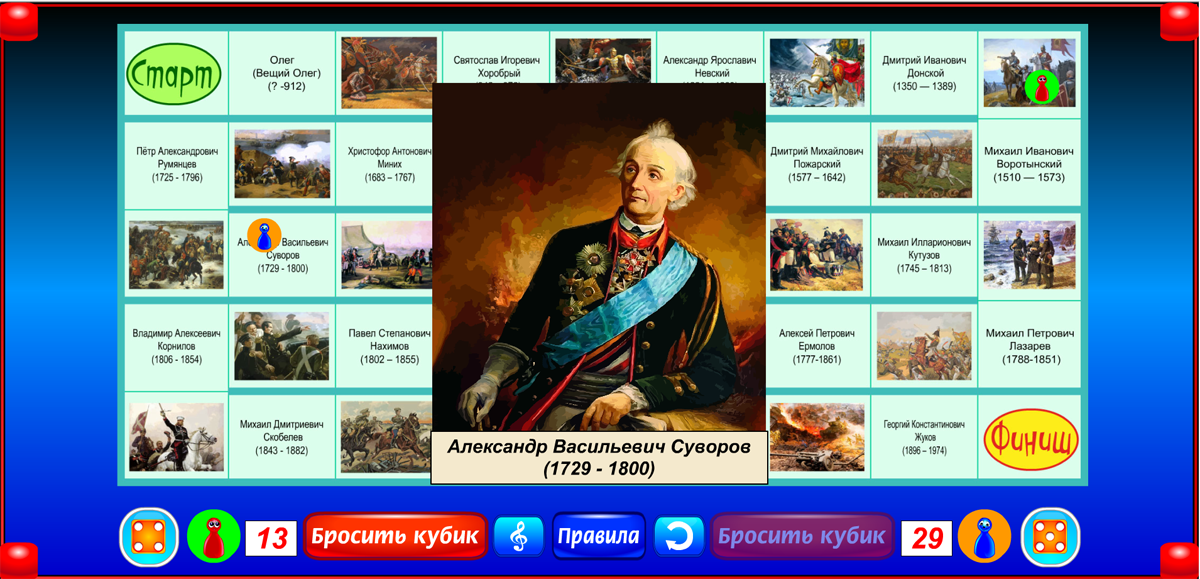 Бросая кубик и перемещаясь на число шагов, соответствующее числу выпавших очков, игрок знакомится с народами страны, её правителями, полководцами и героями России. Когда фишка попадает на имя выдающегося человека, открывается его портрет и звучит короткий рассказ о нём. При этом игрок получает дополнительно пять очков к результату, выпавшему на кубике. Если первой финиширует фишка с большим, чем у соперника числом очков, она объявляется победителем. Если первой приходит фишка с меньшим числом очков, чем набрал отставший соперник, объявляется ничья.