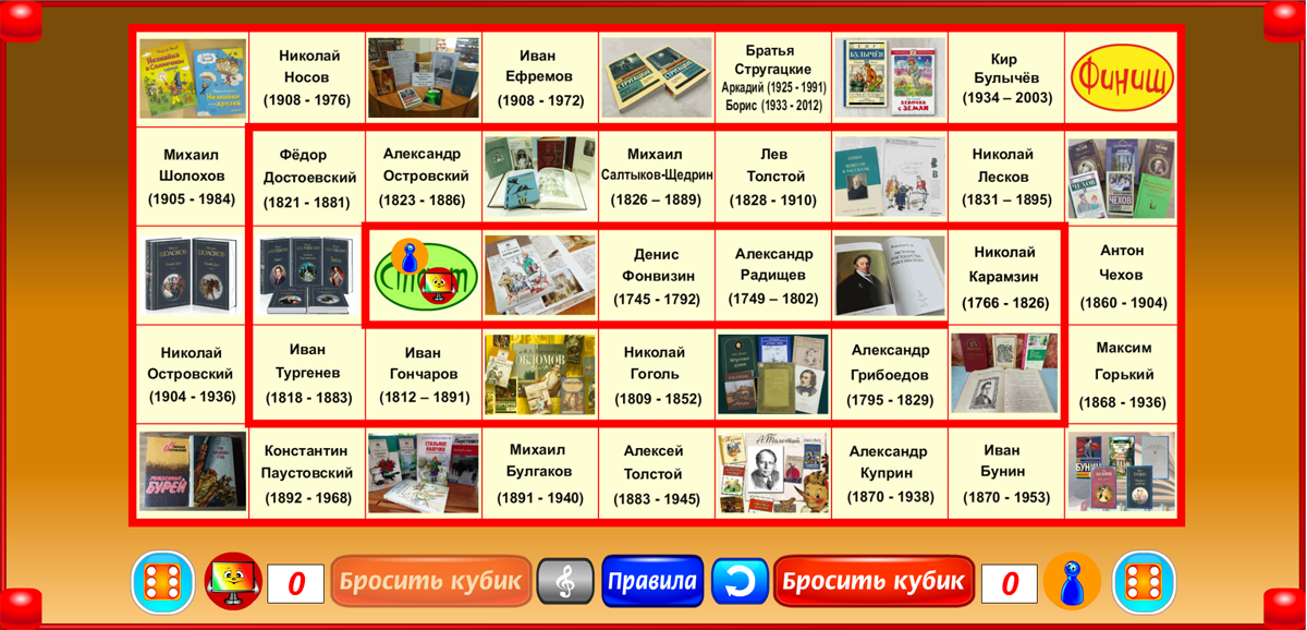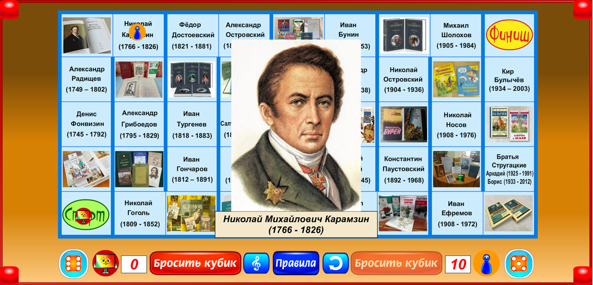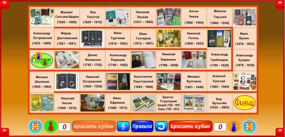 Бросая кубик и перемещаясь на число шагов, соответствующее числу выпавших очков, игрок знакомится с писателями России. Когда фишка попадает на имя писателя, открывается его портрет и звучит короткий рассказ о нём. При этом игрок получает дополнительно пять очков к результату, выпавшему на кубике. Если первой финиширует фишка с большим, чем у соперника числом очков, она объявляется победителем. Если первой приходит фишка с меньшим числом очков, чем набрал отставший соперник, объявляется ничья.