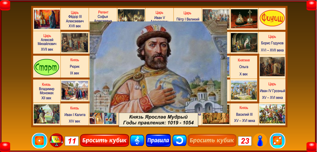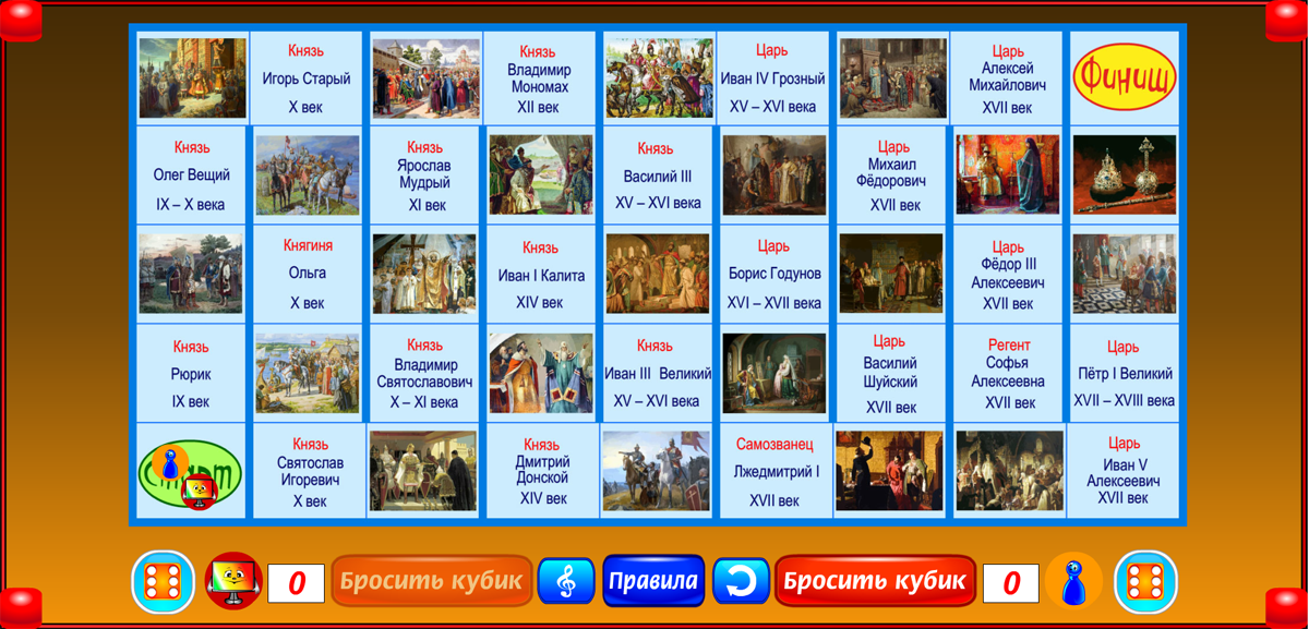 Бросая кубик и перемещаясь на число шагов, соответствующее числу выпавших очков, игрок знакомится с правителями России. Когда фишка попадает на имя правителя, открывается его портрет и звучит короткий рассказ о нём. При этом игрок получает дополнительно пять очков к результату, выпавшему на кубике. Если первой финиширует фишка с большим, чем у соперника числом очков, она объявляется победителем. Если первой приходит фишка с меньшим числом очков, чем набрал отставший соперник, объявляется ничья.