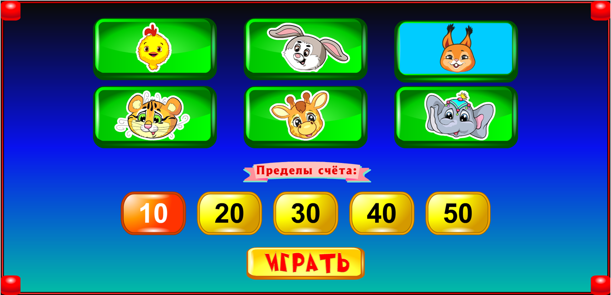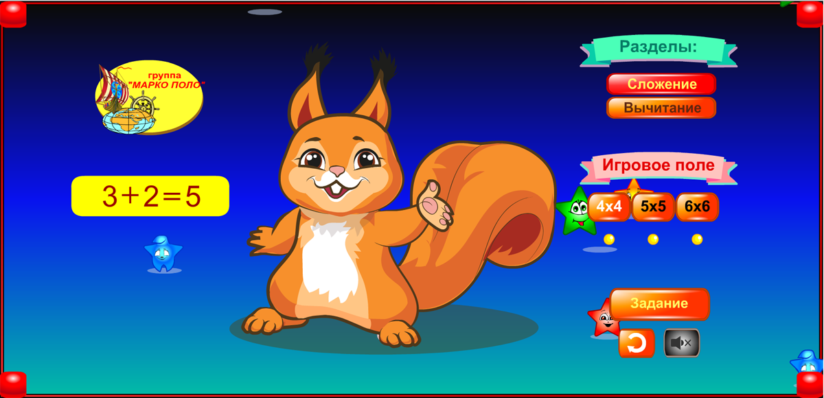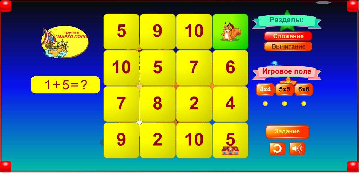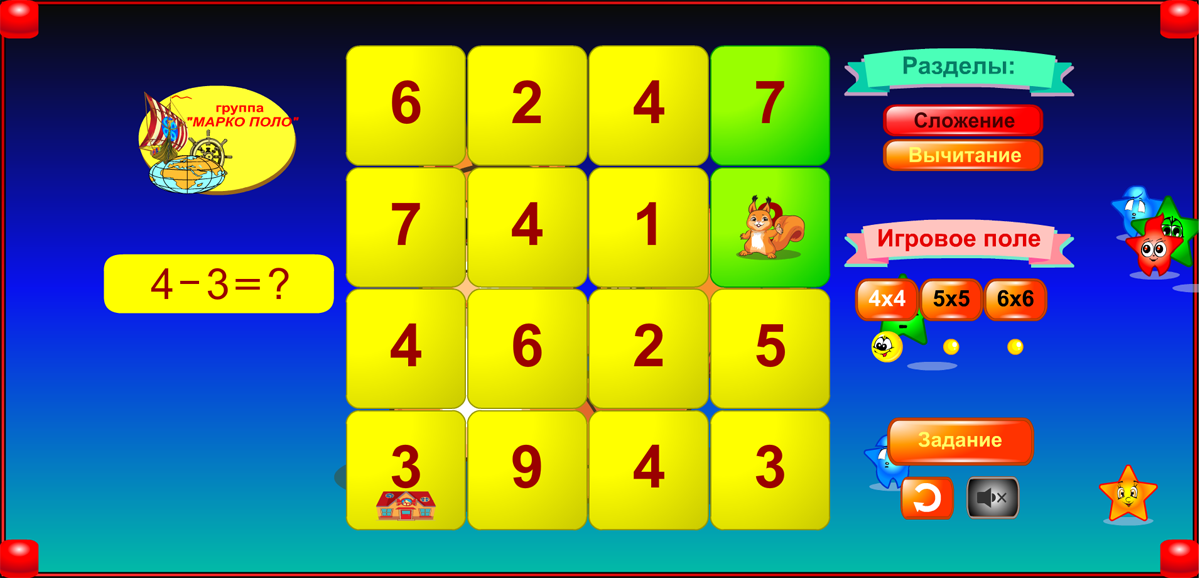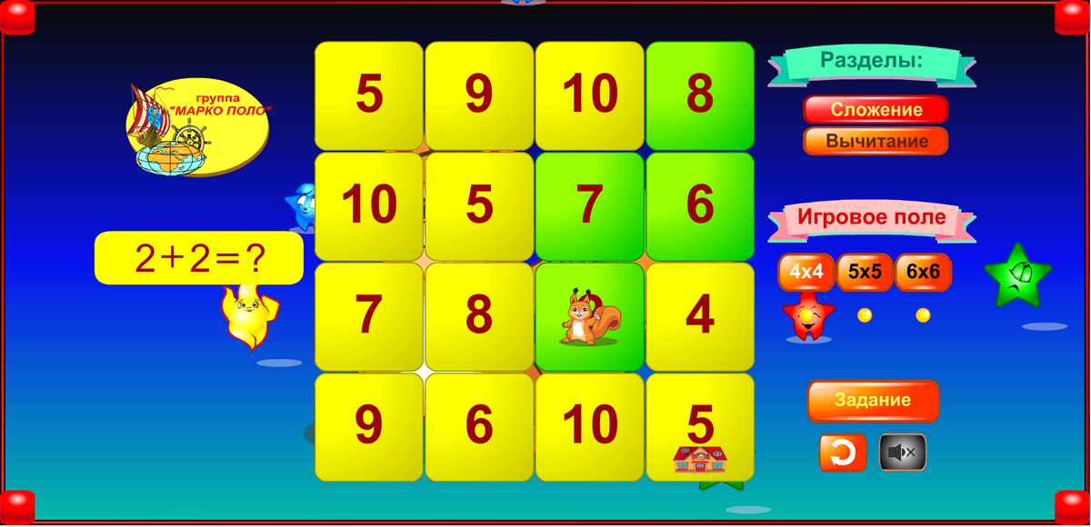 Щёлкая по числам, которые являются ответами на появляющиеся примеры, нужно проложить дорожку к домику. По мере выполнении задания ячейки на игровом поле меняют цвет, а персонаж продвигается по ним к домику. Когда персонаж достигает домика, он появляется в полный рост и благодарит ребёнка. При выполнении задания с одной из арифметических операций на соответствующем пределу счёта месте появляется смайлик, который меняется на звёздочку при выполнении задания на вторую арифметическую операцию. Когда ребёнок заработает вcе золотые звёзды, он получит устную похвалу компьютера.