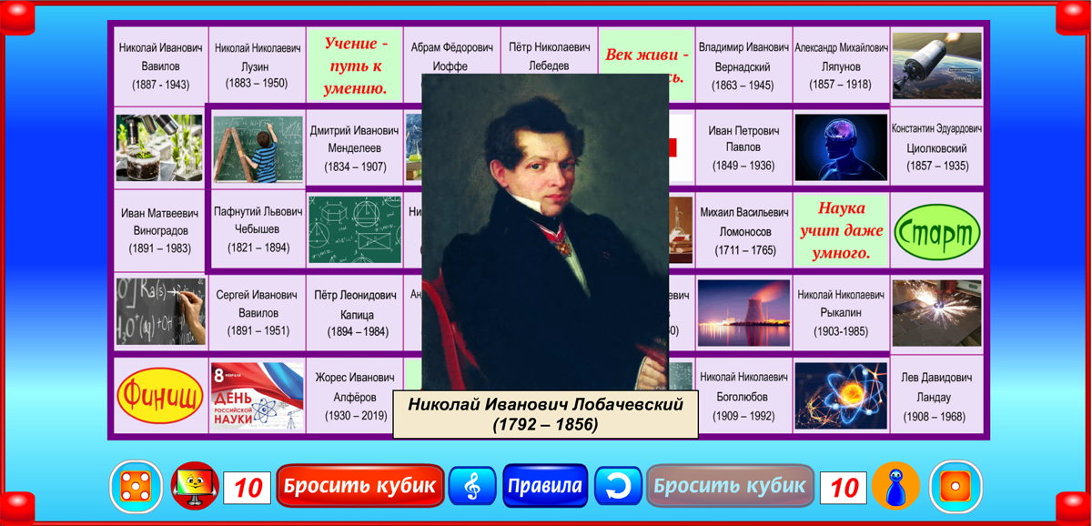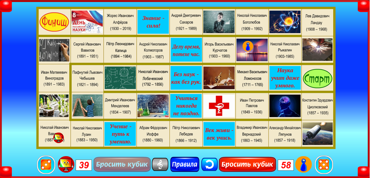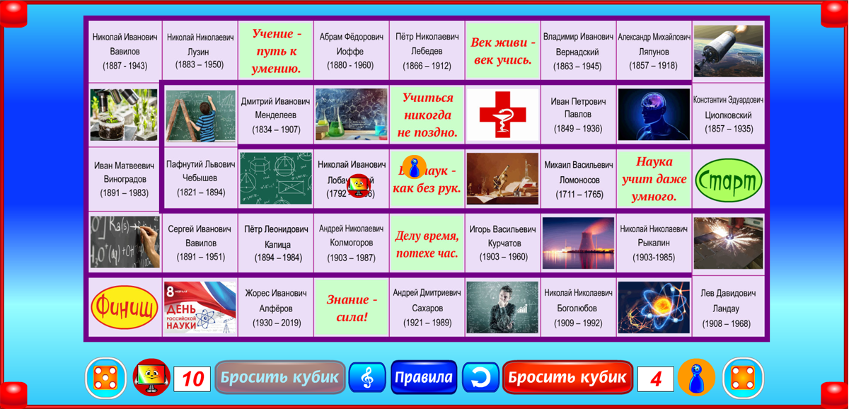 Бросая кубик и перемещаясь на число шагов, соответствующее числу выпавших очков, игрок знакомится с учёными России. Когда фишка попадает на имя учёного, открывается его портрет и звучит короткий рассказ о нём. При этом игрок получает дополнительно пять очков к результату, выпавшему на кубике.