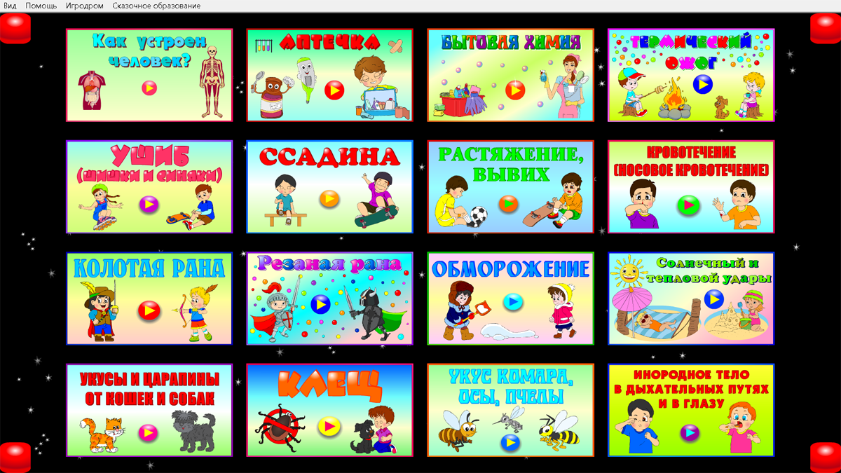 6. Раздел "Помощник Айболита" включает включает набор игр-заданий, знакомящих ребёнка с приёмами оказания первой помощи.