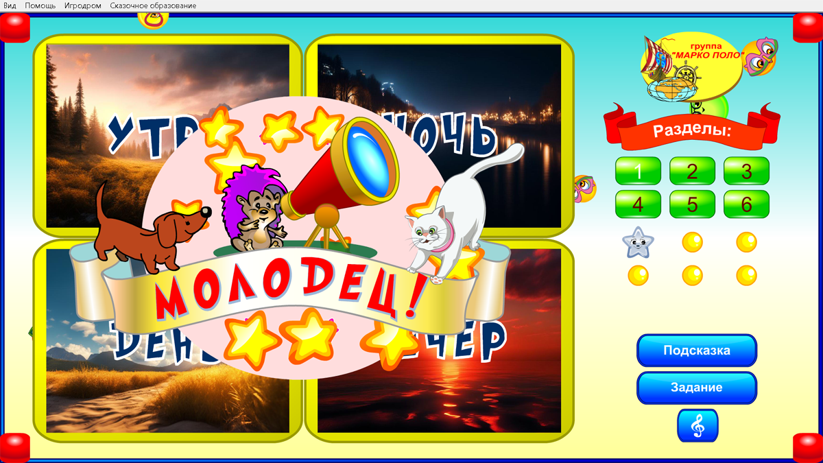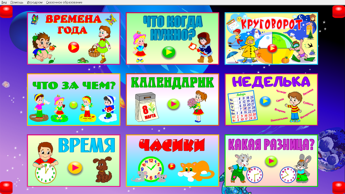 2. Раздел "Время и календарь" представляет собой игровой тренажёр для знакомства детей с принятыми способами измерения времени.