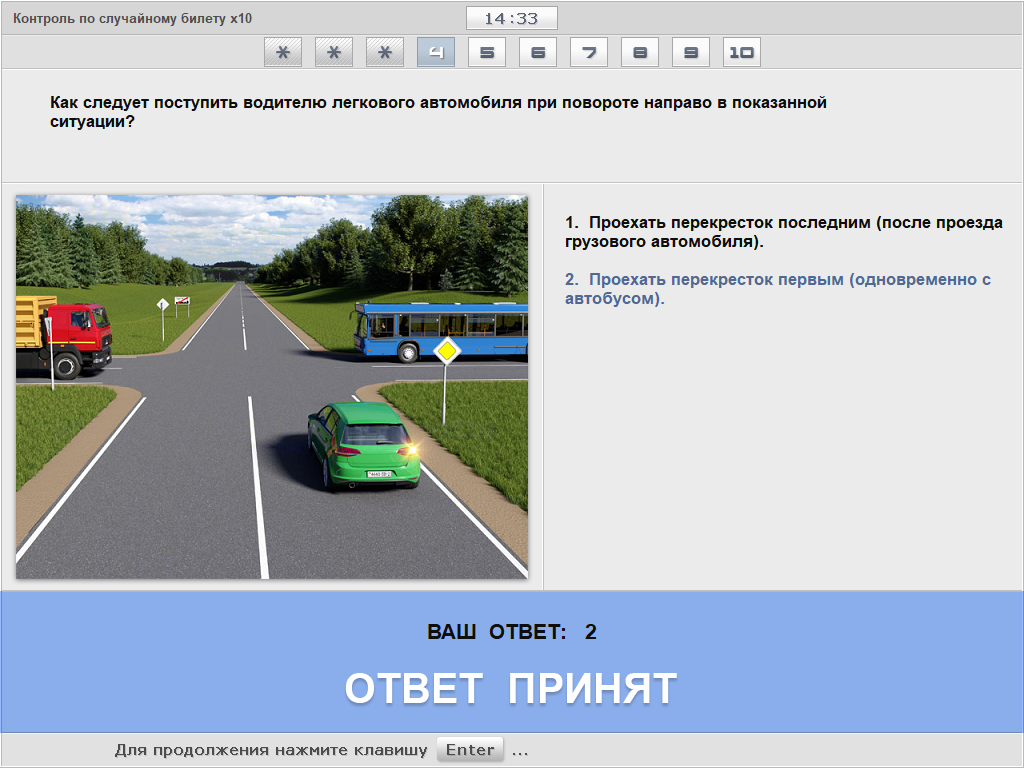 - В режиме «Контроль по случайному билету x10» после ответа на каждый вопрос отобразится надпись «ОТВЕТ ПРИНЯТ». То есть билет решается «вслепую», а результаты ответов будут выданы только по завершении тестирования (аналог выпускного экзамена автошколы).