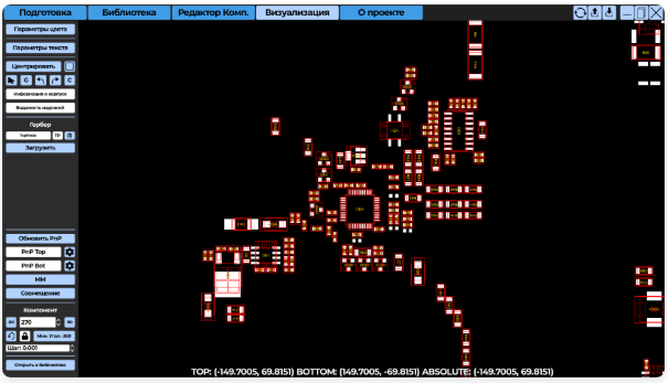 Программа визуализирует печатную плату на основе Gerber-файлов и размещённых компонентов. Меняйте координаты, поворачивайте и перемещайте элементы, корректируйте точку отсчёта — все изменения моментально отображаются в таблицах и на графике.
