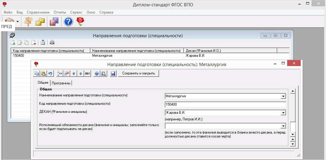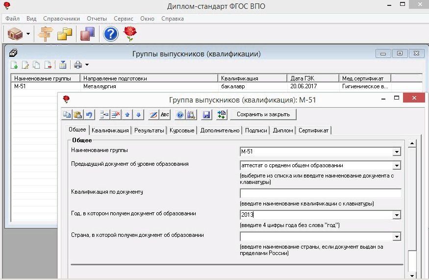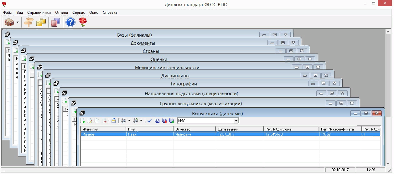 Разработана для заполнения и печати выпускных документов: титулов дипломов и приложений к дипломам бакалавров, магистров, специалистов высшего образования (ФГОС) на бланках нового образца 2014 года, а также для заполнения сертификатов специалистов, выдаваемых медицинским и фармацевтическим работникам, кроме того, в программу добавлена возможность заполнения выпускных документов профессиональной переподготовки.