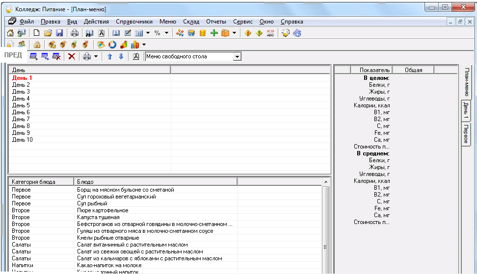- Составление и печать меню на каждый день с использованием справочников приемов пищи раздельно для каждой категории довольствующихся, например, "Обшая", "Студенты 15-18 лет".