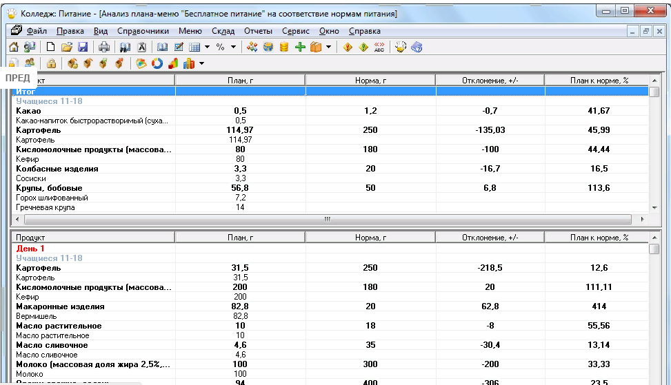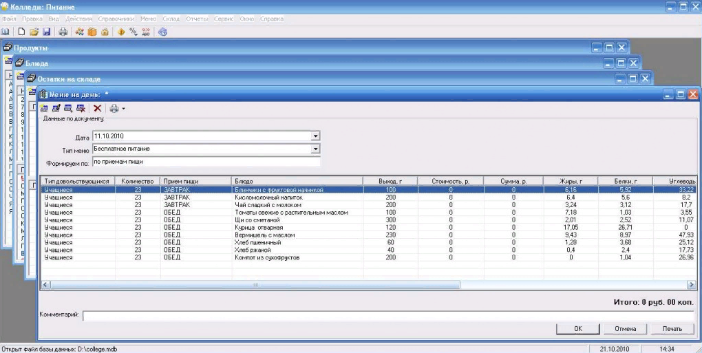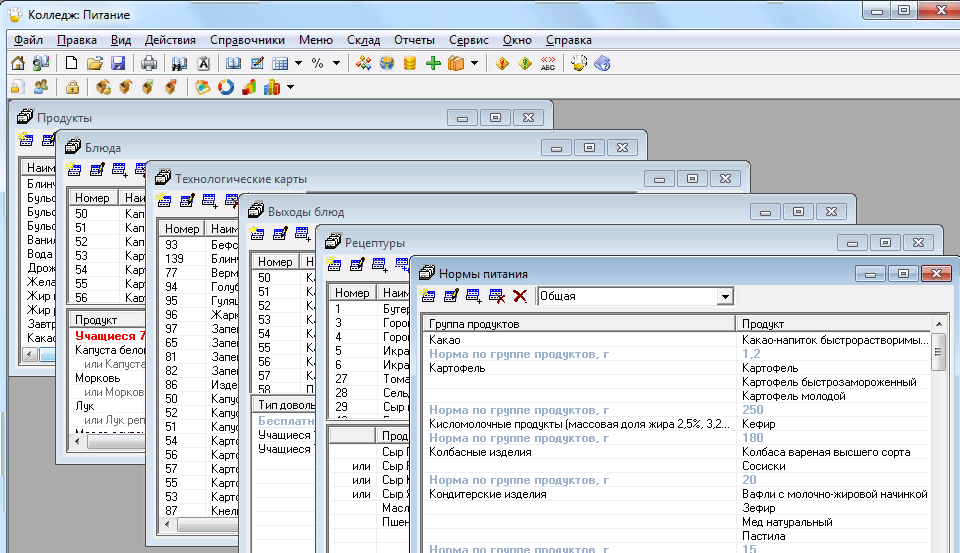 Колледж: Питание — программа для организации питания и учета продуктов в учреждениях начального и среднего профессионального образования (колледжах, техникумах, лицеях, училищах).