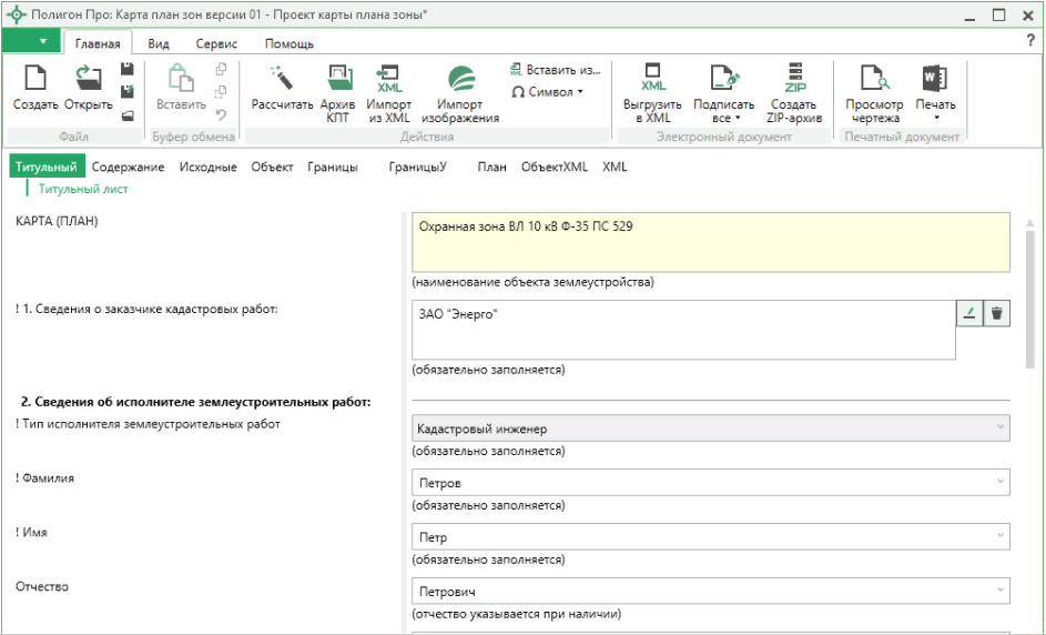 - Экспорт данных в XML-формат для представления в орган кадастрового учета в форме электронного документа.