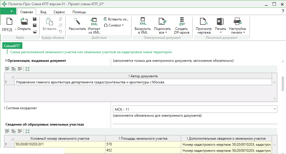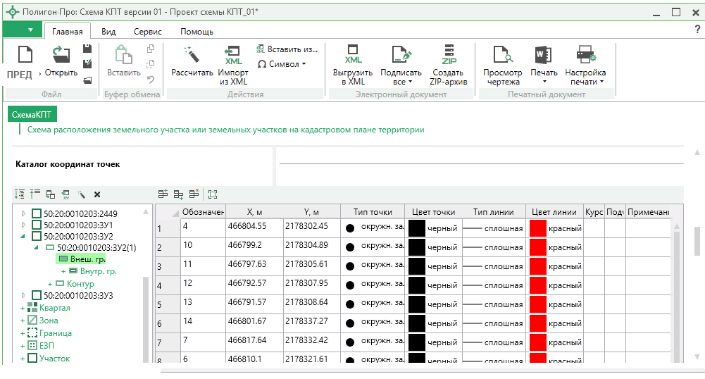 - Экспорт данных в XML-формат для предоставления в орган кадастрового учета в форме электронного документа.