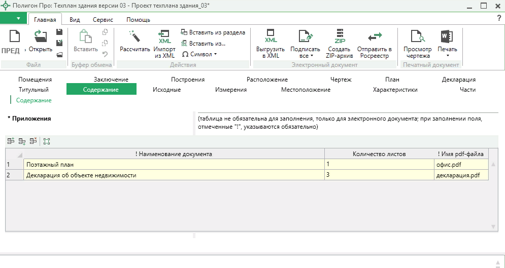 - Экспорт технического плана в XML-формат для предоставления в орган кадастрового учета в форме электронного документа.