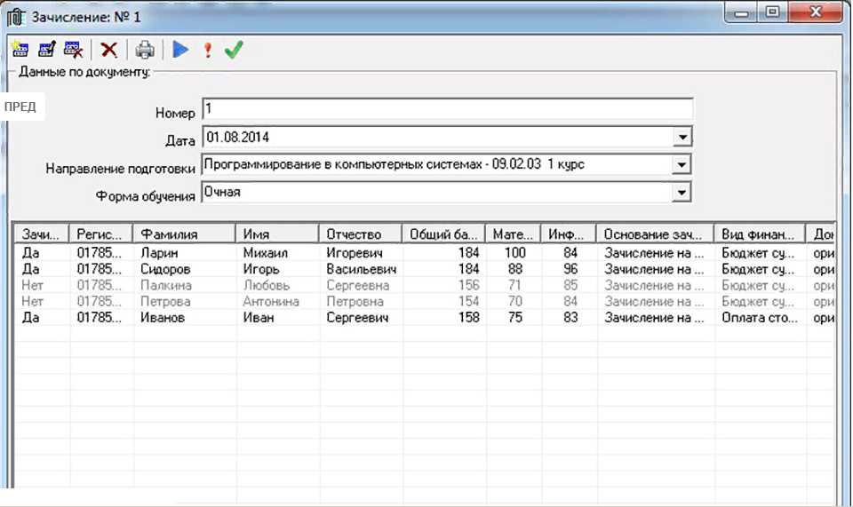 - Автоматическое формирование списков абитуриентов, рекомендованных к зачислению, и резервных списков.