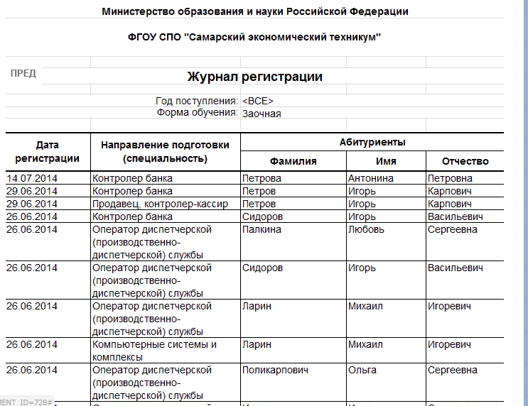 - Формирование журналов регистрации и учета документов абитуриентов.